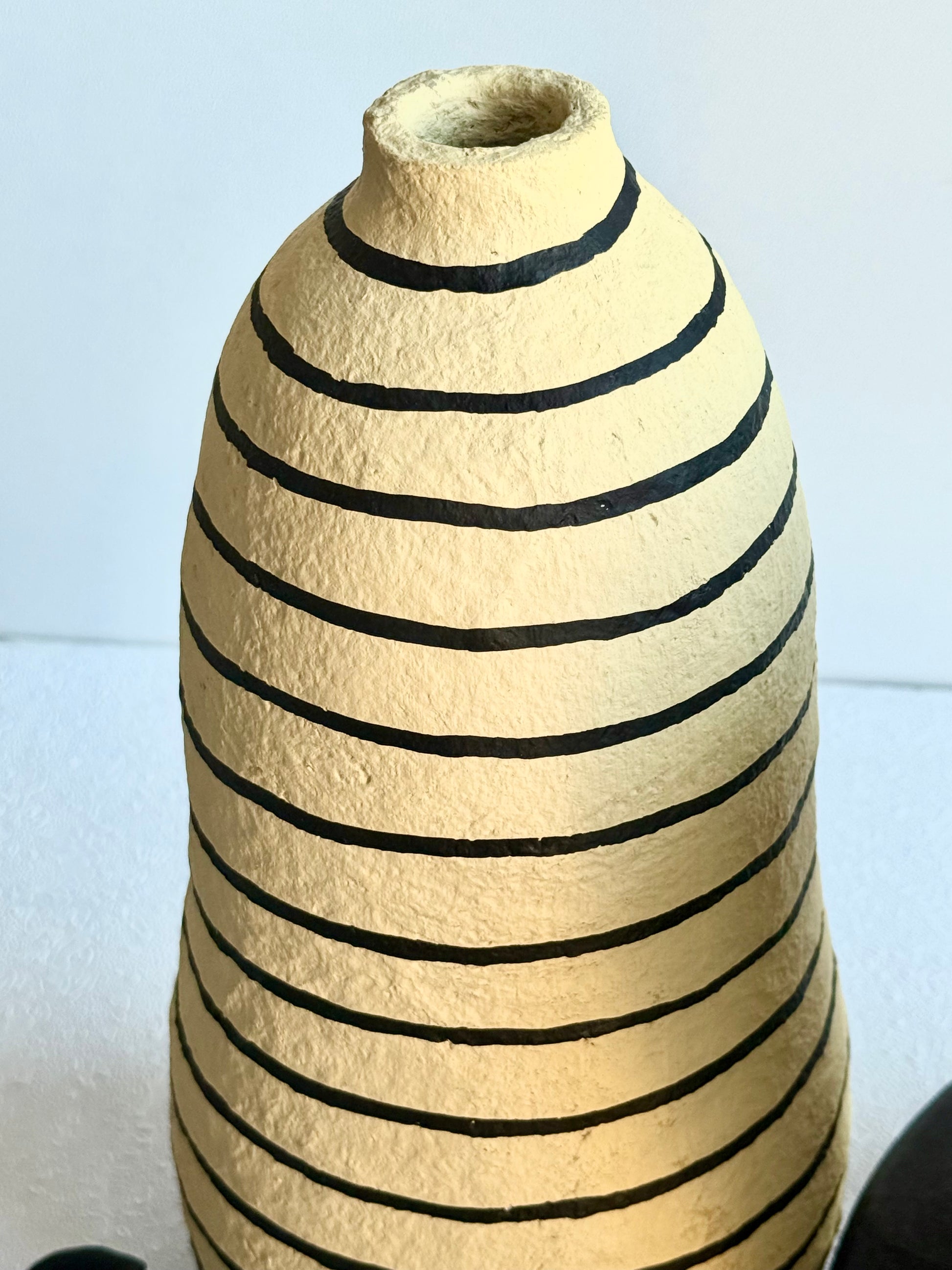 Ръчно изработена ваза от папиемаше с нестандартна форма и черно-бели линии. Materia е среща между скулптурна експресия и артистичен минимализъм — за пространства с характер и душа.