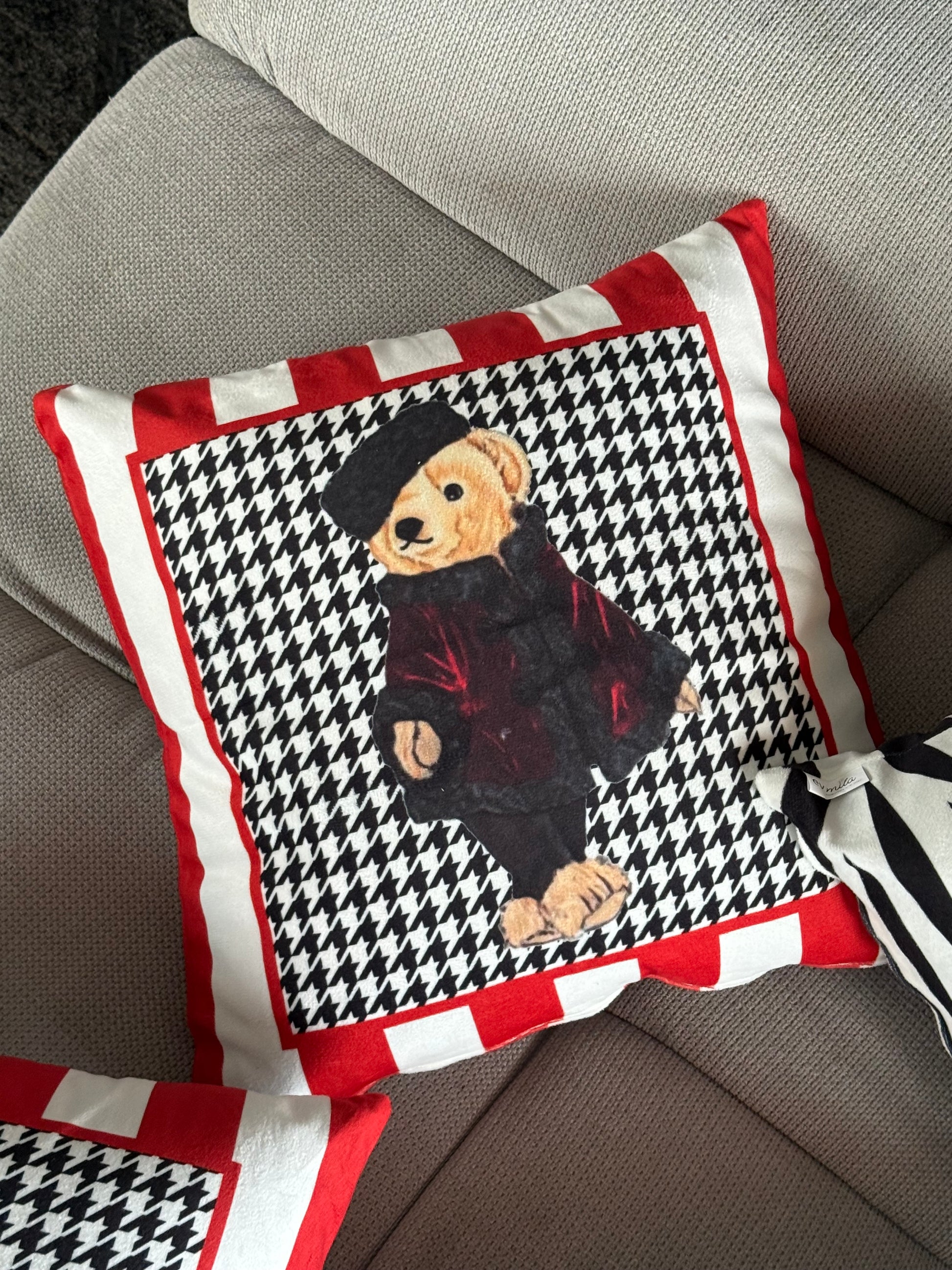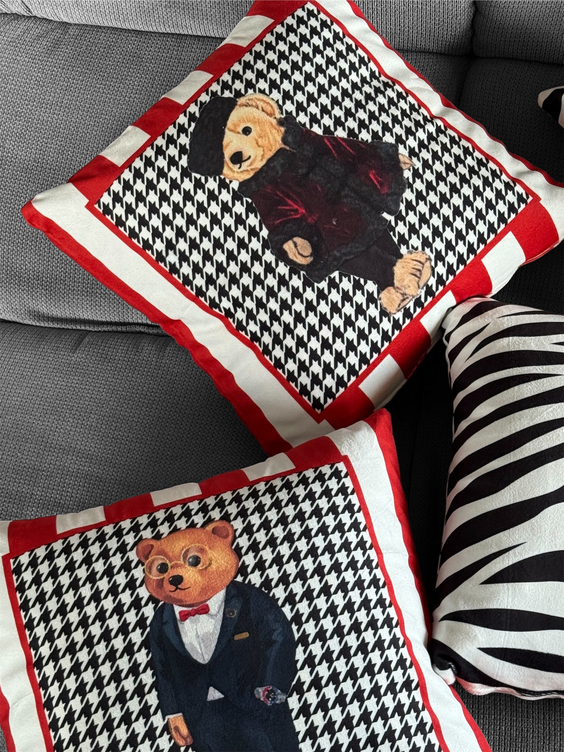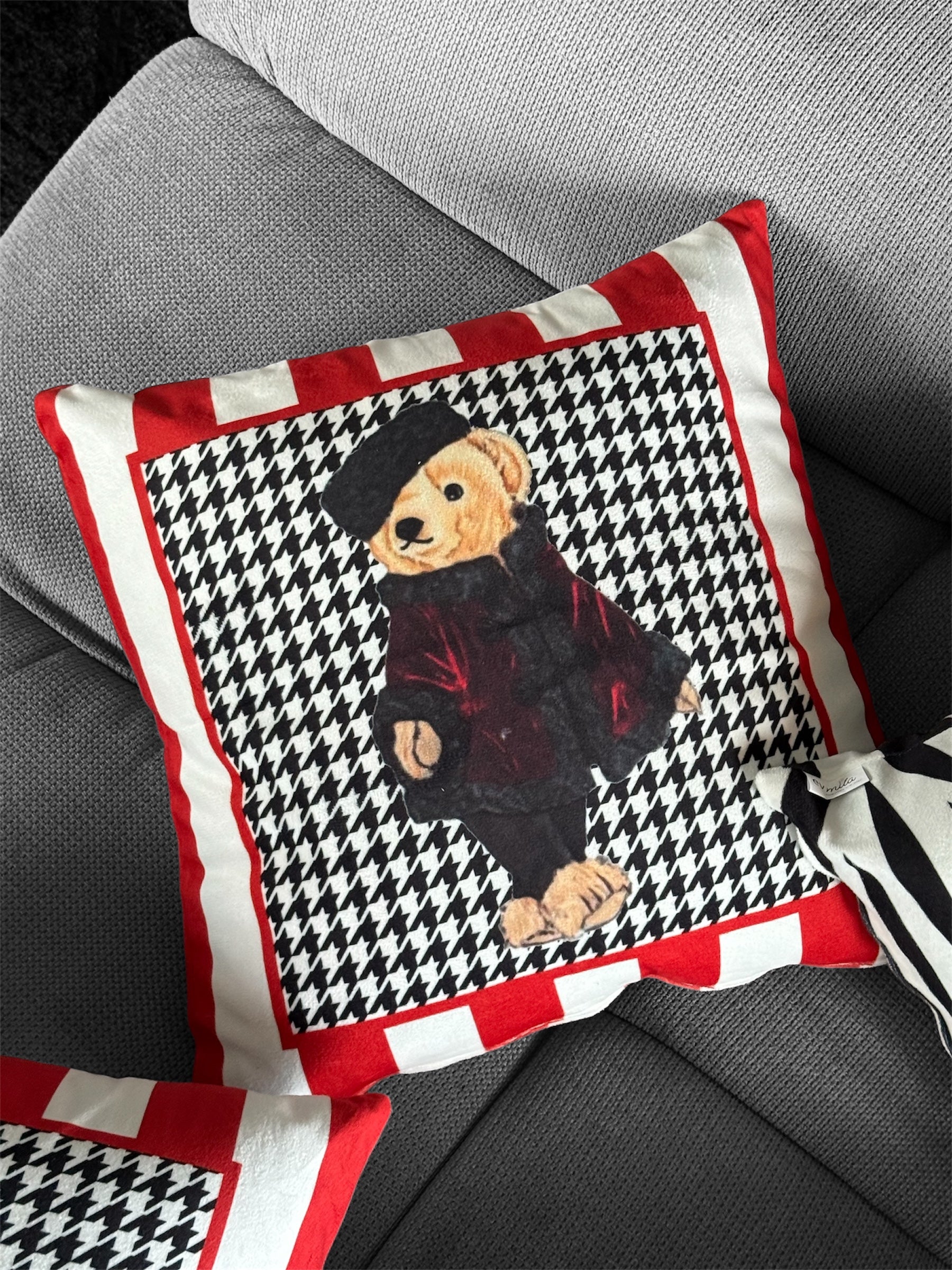 Калъфка за декоративна възглавница с двустранно изображение на мече, изработена от мека кадифена материя. Закопчаване със скрит цип.