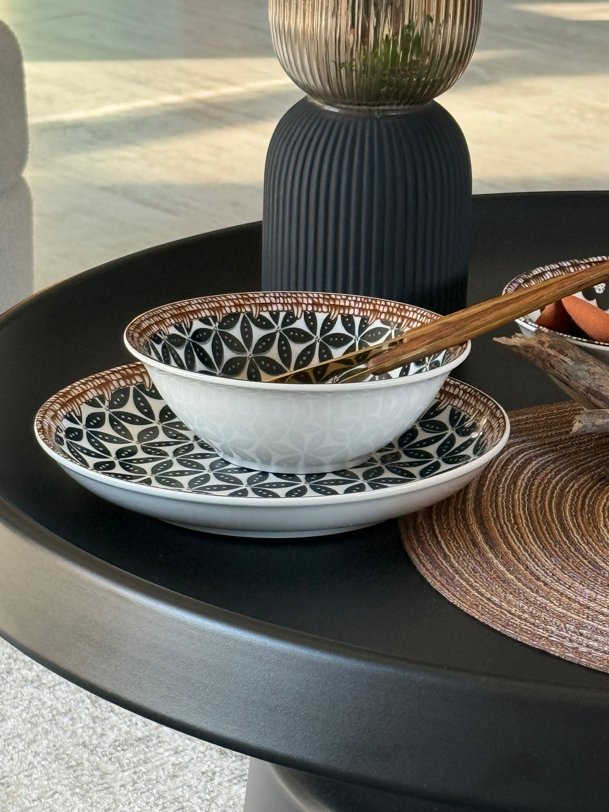Средно голяма, дълбока чиния с геометричен дизайн и кафяв кант. Съчетава се с с останалите съдове от колекцията Dorna.