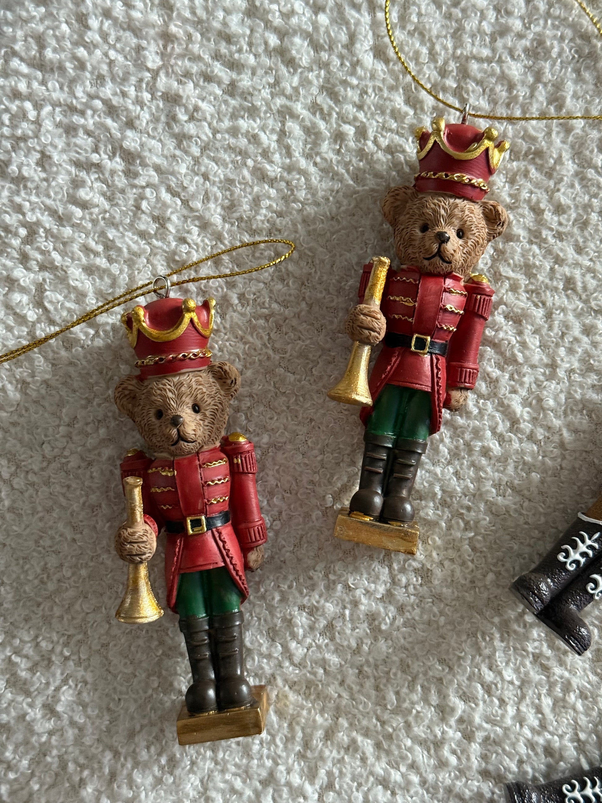 Коледна играчка за елха от полирезин във формата на мече със златен конец за закачане на елха.