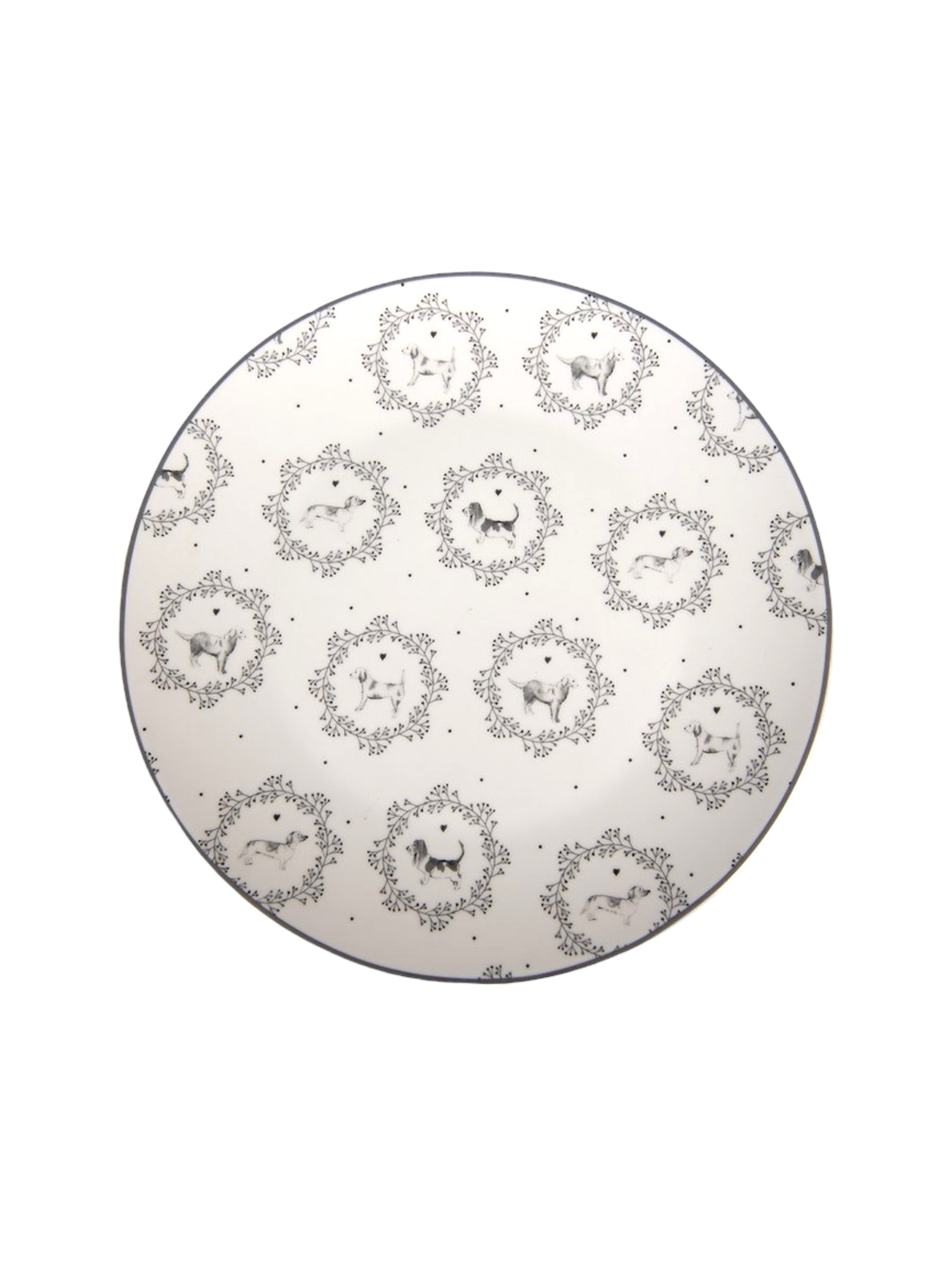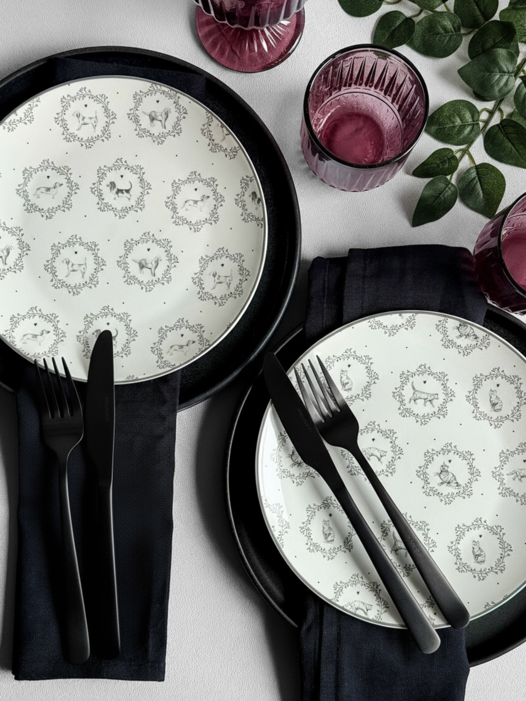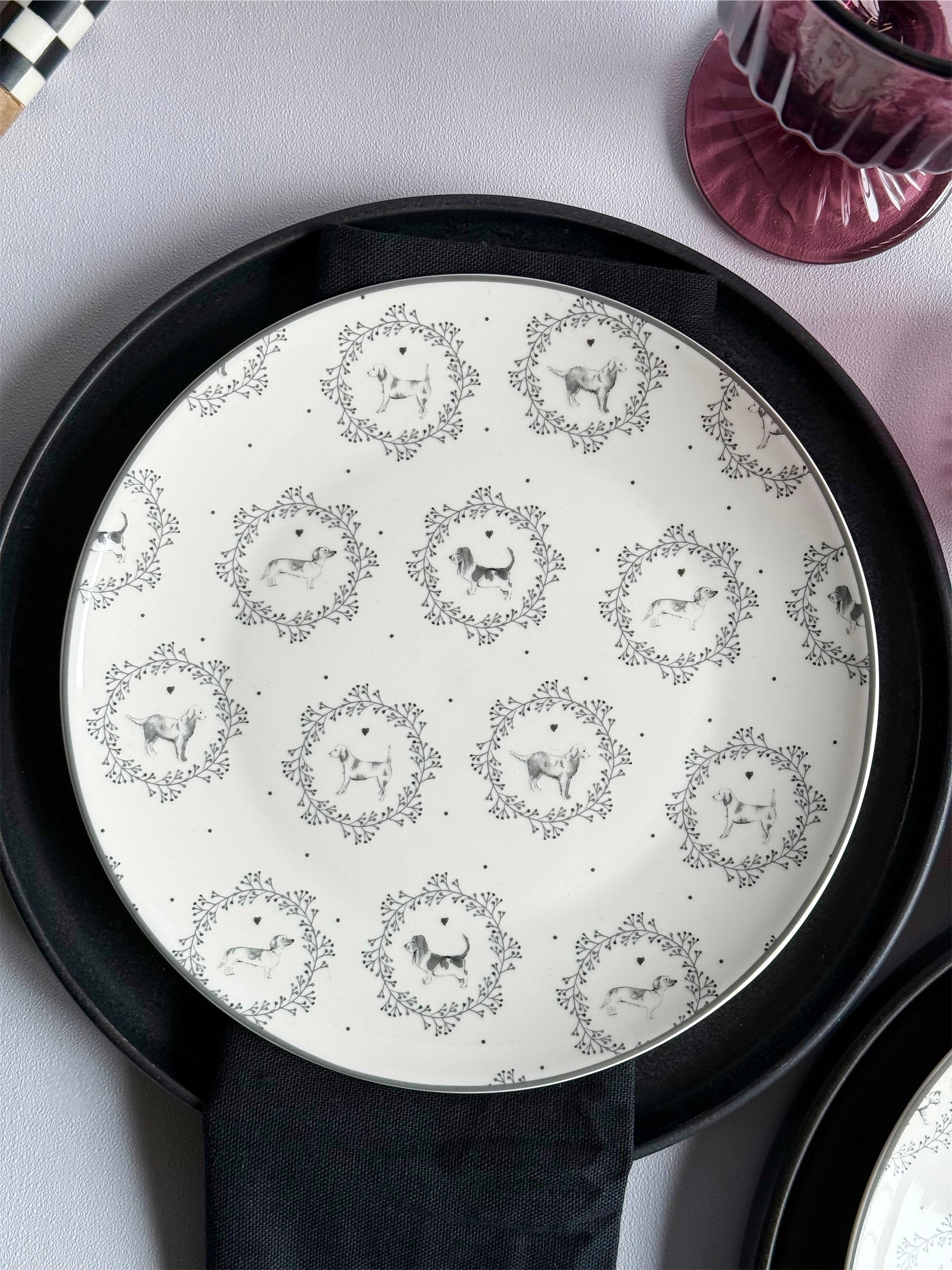 Чиния за предястие или десерт от порцелан с животински мотиви в черен цвят с розов кант на борда. Съчетават се със същите чинии от серията Kitty.