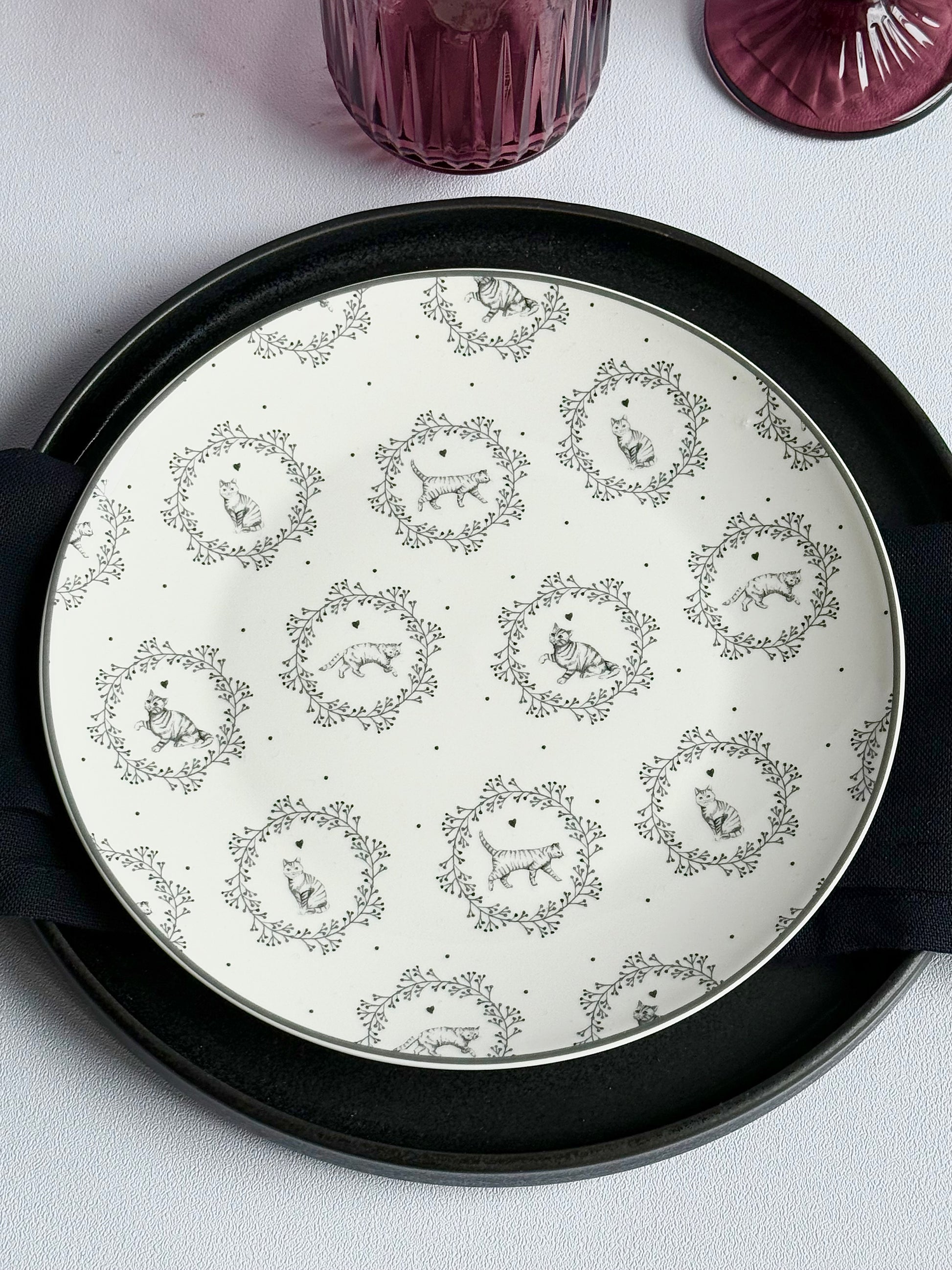 Чиния за предястие или десерт от порцелан с животински мотиви в черен цвят с розов кант на борда. Съчетават се със същите чинии от серията Doggy.