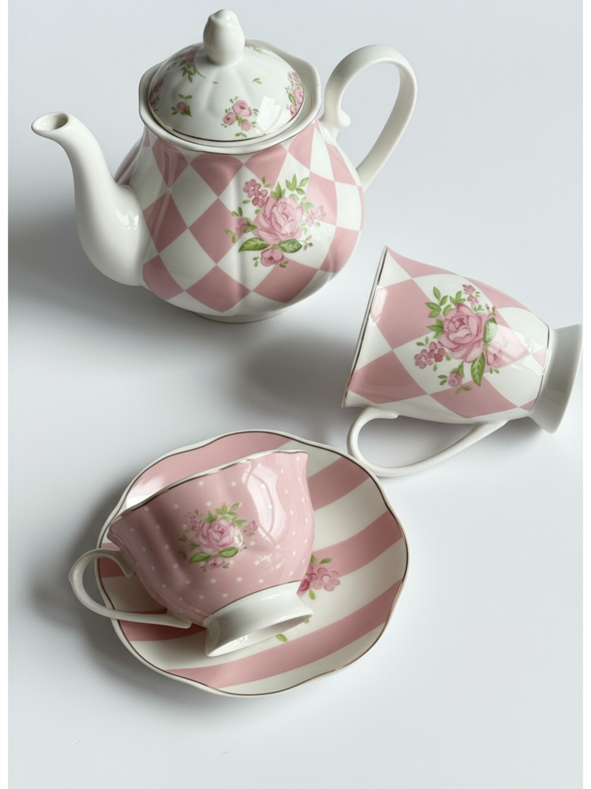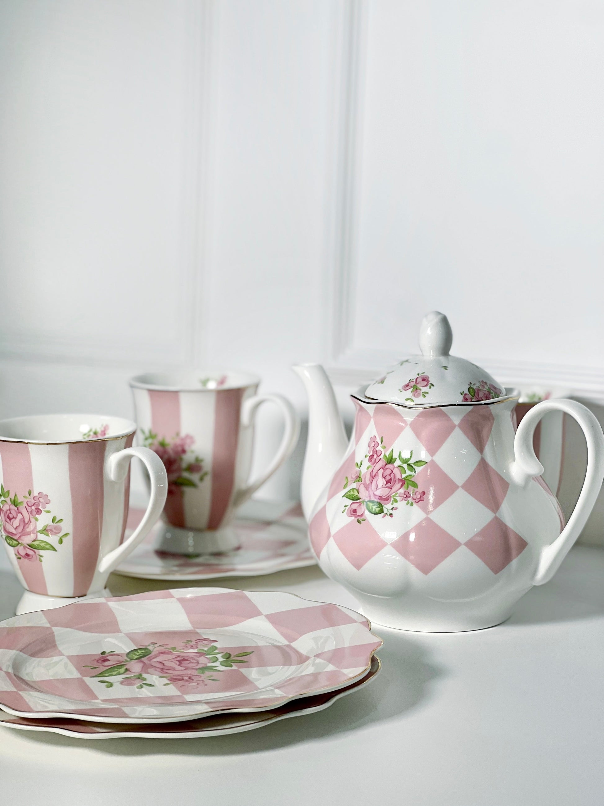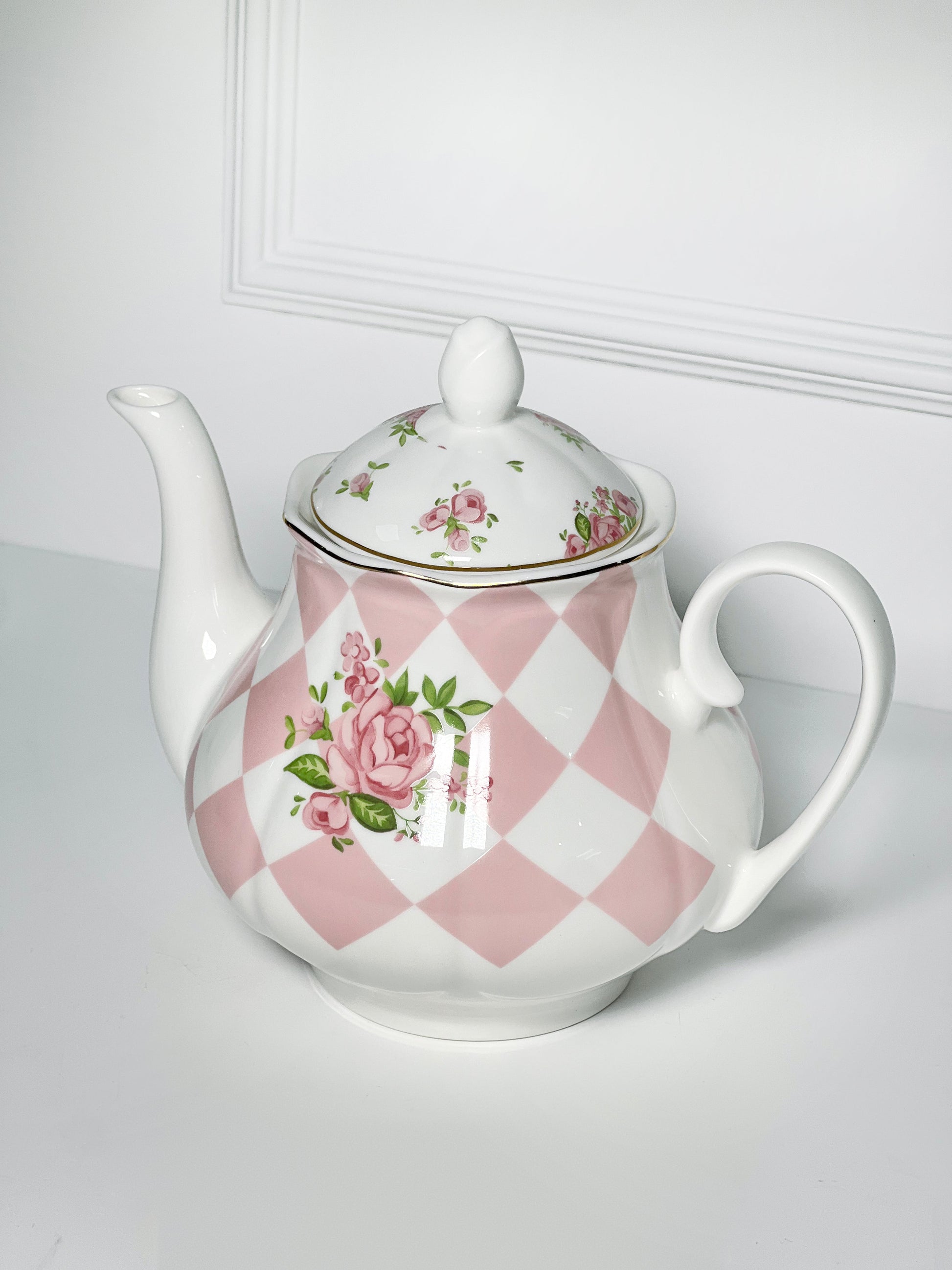 Чайник с капак от порцелан с флорални мотиви и изискан дизайн в розов цвят. Съчетава се с чаши за кафе и чай с чинийки и големи чаши за топли напитки от същата серия Rosa.