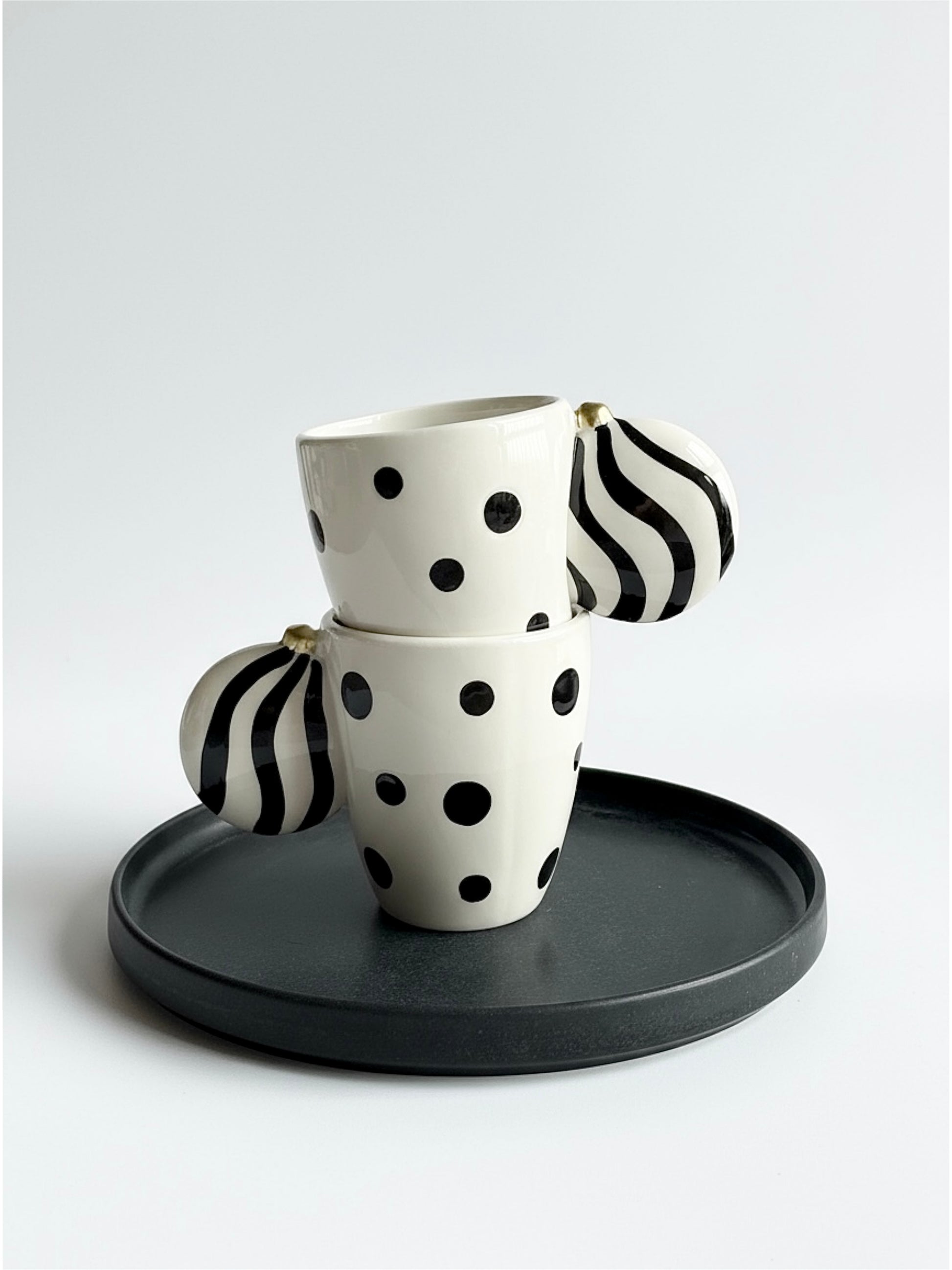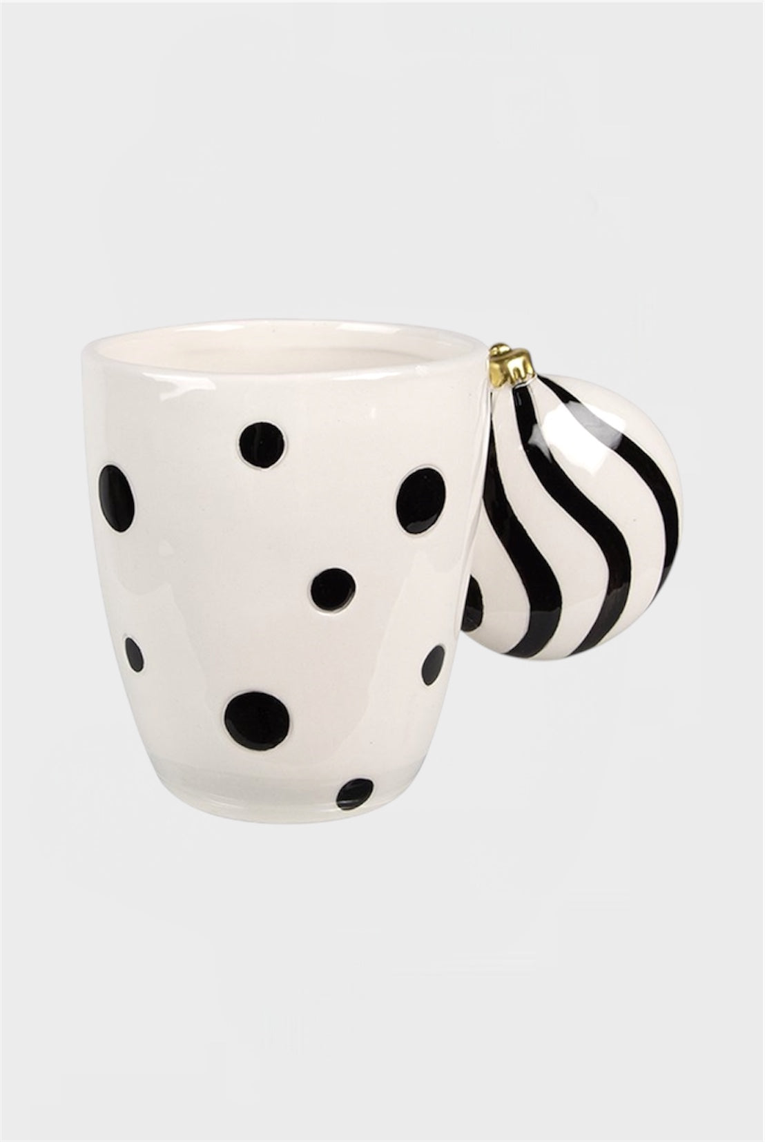 Голяма Коледна чаша в бяло на черни точки. Изработена е от висококачествена, глазирана керамика и дръжка с дизайн на Коледна играчка за елха.