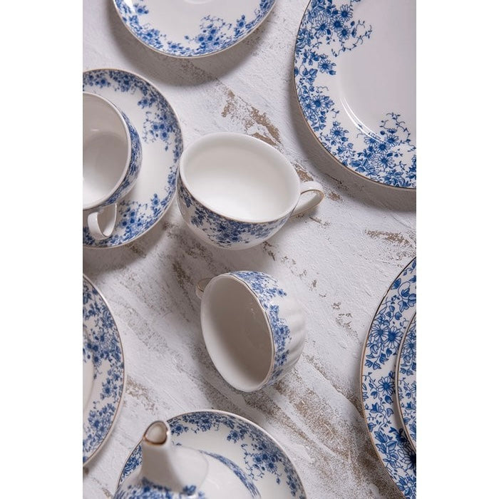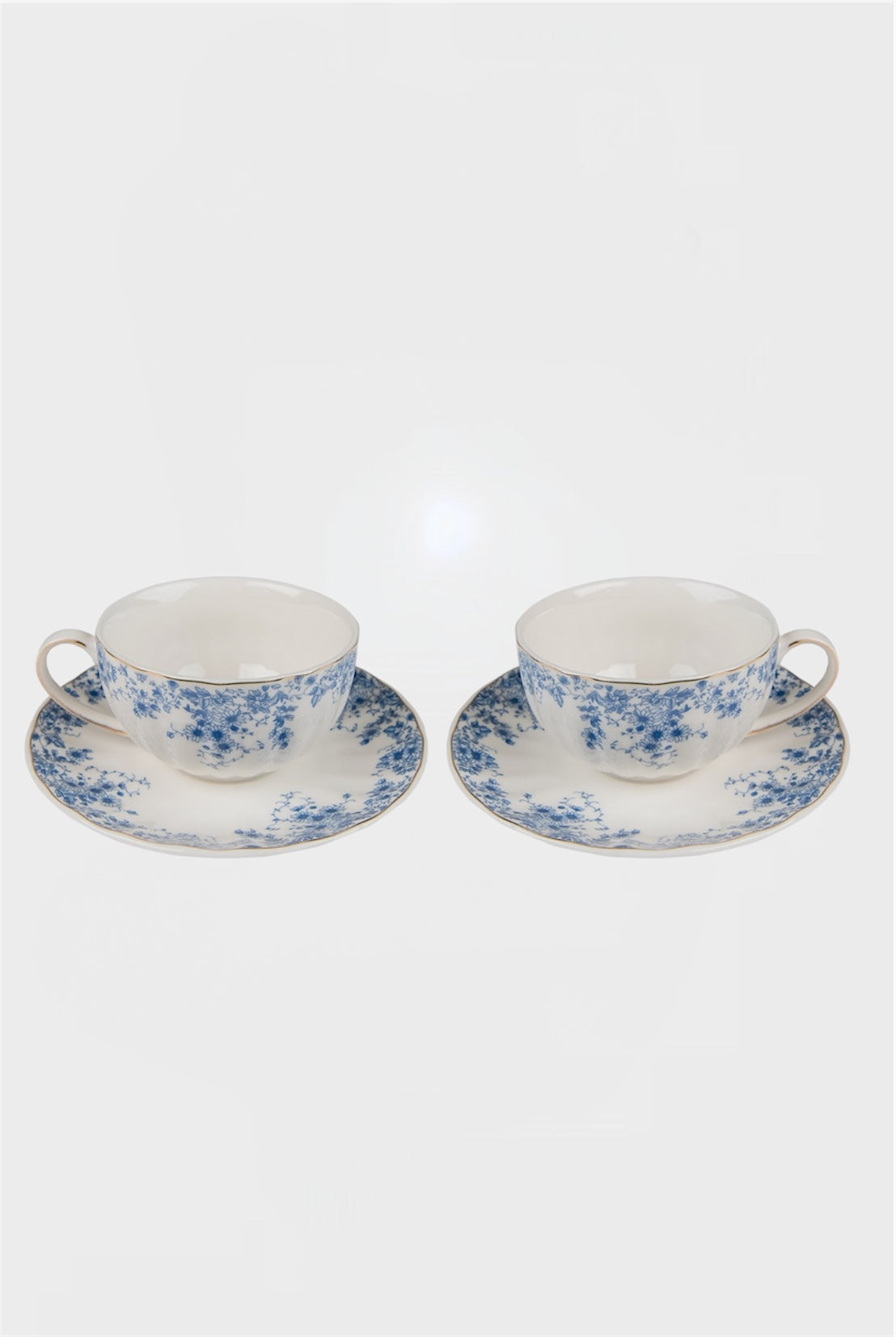 Комплект 2 броя чаши с чинийки за кафе и чай с флорални мотиви в син цвят и златен кант по ръба на чашата и чинията.